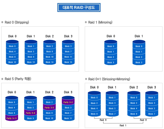 ③ 여러 개의 디스크를 모아서 하나의 디스크로 만들었으니 그 중 하나 혹은 그 이상의 디스크에 장애가 나더라도 최소한 데이터가 사라지는 것을 방지하는 것
